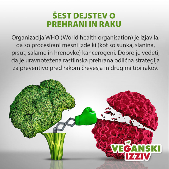 Svetovna zdravstvega organizacija WHO je pred nekaj leti razglasila mesne proizvode, kot so npr. šunka, slanina, salama ter hrenovke za kancerogene. Dobro se je zavedati, da je uravnotežena veganska prehrana že sama po sebi odlična preventivna strategija za preprečevanje raka na črevesju, kot tudi mnogih drugih vrst rakavih obolenj.